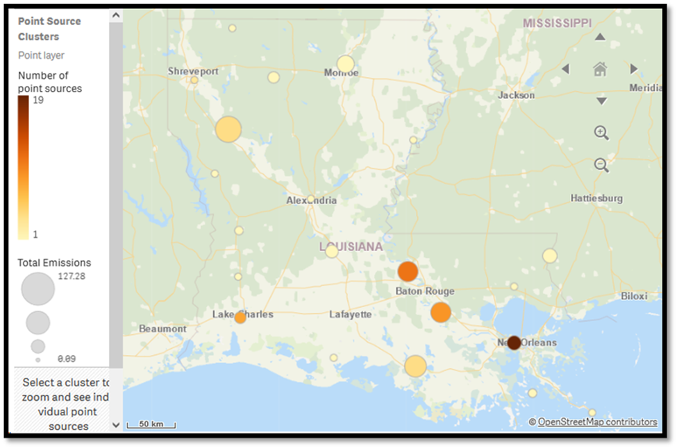 Figure 1. Point source emissions of hydrogen sulfide in Louisiana for 2017, represented in clusters. The size of the circles corresponds to the quantity of total emissions (the larger the circle, the higher the emissions), and the color of the circles corresponds to the number of point sources in a given area (darker means more point sources). Data source: EPA’s National Emissions Inventory (NEI).